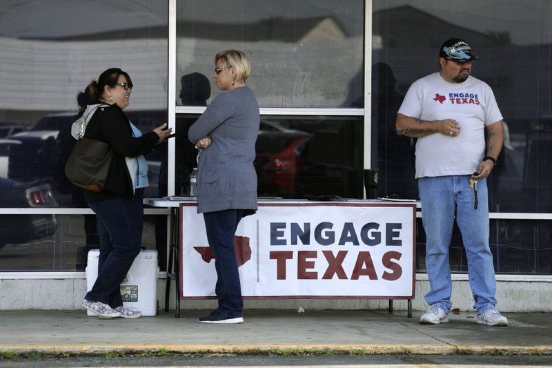 In this Tuesday, Jan. 28, 2020 photo, canvassers with Engage Texas, a political super PAC, seek to sign up voters while set up outside a driver's license office in San Antonio, Texas. With their base not expanding and their margins of victory getting thinner, Texas Republicans have begun spending big on finding more conservatives to vote. (AP Photo/Eric Gay)
