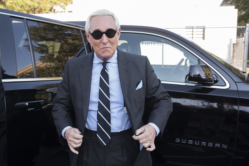 Stone had no immediate reaction in court when Jackson announced his sentence. Later, he emerged from the courthouse to a crowd exchanging back and forth chants of “Lock him up” and “Pardon Roger Stone.” Stone got into a black SUV without speaking to reporters.