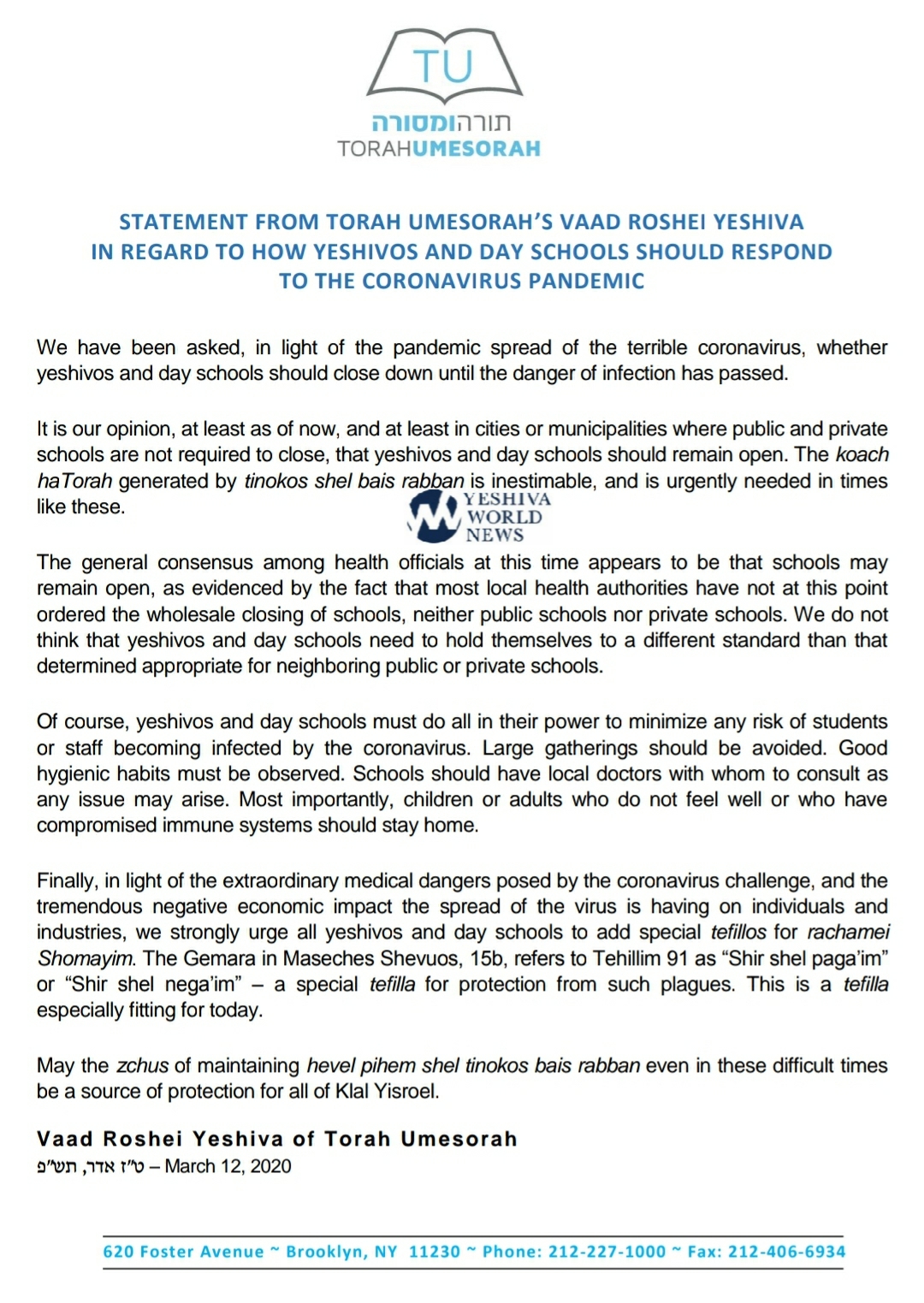 Finally, in light of the extraordinary medical dangers posed by the coronavirus challenge, and the tremendous negative economic impact the spread of the virus is having on individuals and industries, we strongly urge all yeshivos and day schools to add special tefillos for rachamei Shomayim. The Gemara in Maseches Shevuos, 15b, refers to Tehillim 91 as “Shir shel paga’im” or “Shir shel nega’im” – a special tefilla for protection from such plagues. This is a tefilla especially fitting for today.