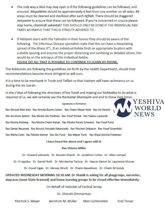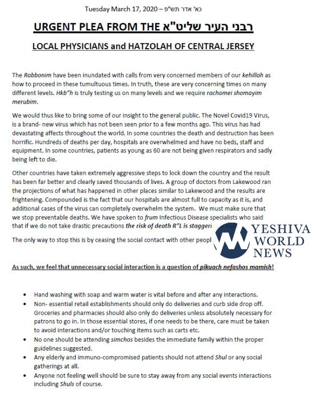 A letter from Lakewood Hatzolah and local doctors was signed yesterday by many Lakewood Rabbonim about the dangers of the virus and what precautions must be taken.