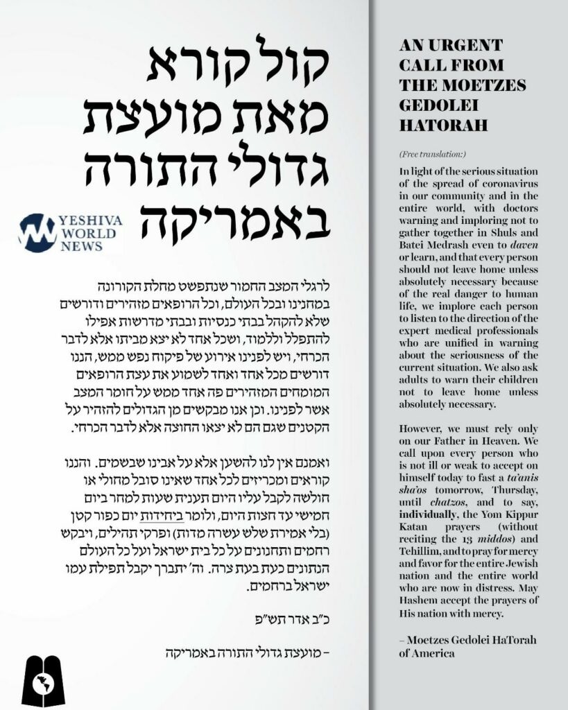 (Free translation:) In light of the serious situation of the spread of coronavirus in our community and in the entire world, with doctors warning and imploring not to gather together in Shuls and Batei Medrash even to daven or learn, and that every person should not leave home unless absolutely necessary because of the real danger to human life, we implore each person to listen to the direction of the expert medical professionals who are unified in warning about the seriousness of the current situation. We also ask adults to warn their children not to leave home unless absolutely necessary.