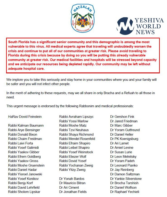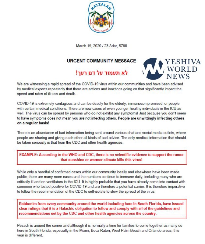 Rabbonim from every community around the world including here in South Florida, have issued clear rulings that it is a Halachic obligation to follow and comply with all of the guidelines and recommendations set by the CDC and other health agencies across the country.