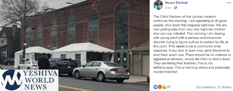 On Friday morning, Dr Ditchik published photos on his Facebook page of people Davening in tents that had been put up outside the Shul. Outraged residents from the Jewish community arrived at the Shul and began screaming at those Davening in the Minyanim, and it nearly turned physical.