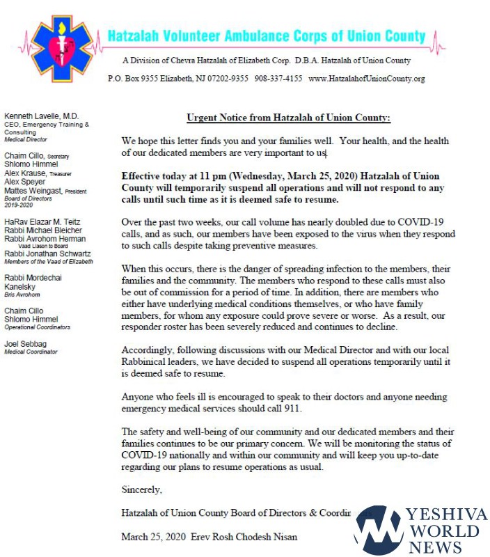 Effective today at 11 pm (Wednesday, March 25, 2020) Hatzalah of Union County will temporarily suspend all operations and will not respond to any calls until such time as it is deemed safe to resume.
