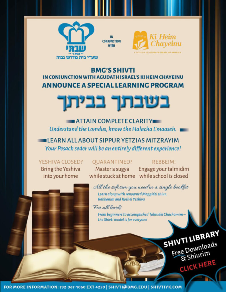 Thousands of Yidden are now home from work, school, or Yeshiva – whether due to school closures, quarantine, or government order. This translates into tens of thousands of hours of time. Hours during which we can accomplish so much. Beth Medrash Govoha’s highly-popular Shivti program is partnering with Agudath Israel’s Ki Heim Chayeinu in rolling out a special B’Shivticha B’veisecha initiative, filling your day with meaning, accomplishment, and the protection that limud Hatorah brings.