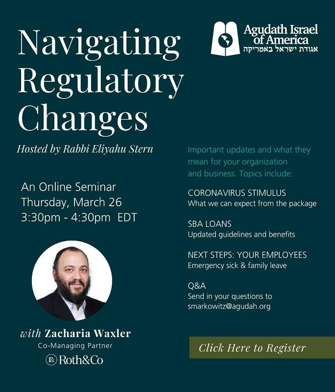 Agudath Israel of America has been working with the Administration, congressional leaders and other faith-based organizations in helping to craft the stimulus legislation. Families, religious entities and charitable institutions within the community are expected to be hard hit by the financial consequences of the contagion.