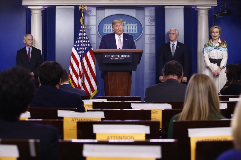 Joining Trump were Vice President Mike Pence, virus task force coordinator Dr. Deborah Birx, and Dr. Anthony Fauci, the U.S. government’s foremost infection disease expert. Each stood far apart from one another on the small stage.The president initially had suggested the country could reopen by Easter but pulled back seeing projections of a staggering death toll even if restrictive measures remain in place. But just days after extending tough national guidelines through the end of April, staring down historic levels of unemployment and economic standstill, he was talking with leaders of professional sports leagues about filling arenas again.