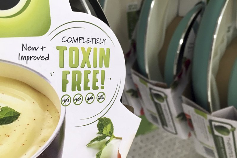 FILE - In this June 17, 2019, file photo in Washington, a label states that these pans do not contain PFAS, perfluoroalkyl and polyfluoroalkyl substances. The White House has intervened to weaken one of the few public health protections pursued by its own administration. Documents released Friday, April 17, 2020, show the White House stepped in to limit the scope of a pending rule that would target imports of products tainted with PFAS, used in nonstick and stain-resistant frying pans, rugs, and countless other consumer products. (AP Photo/Ellen Knickmeyer, File)
