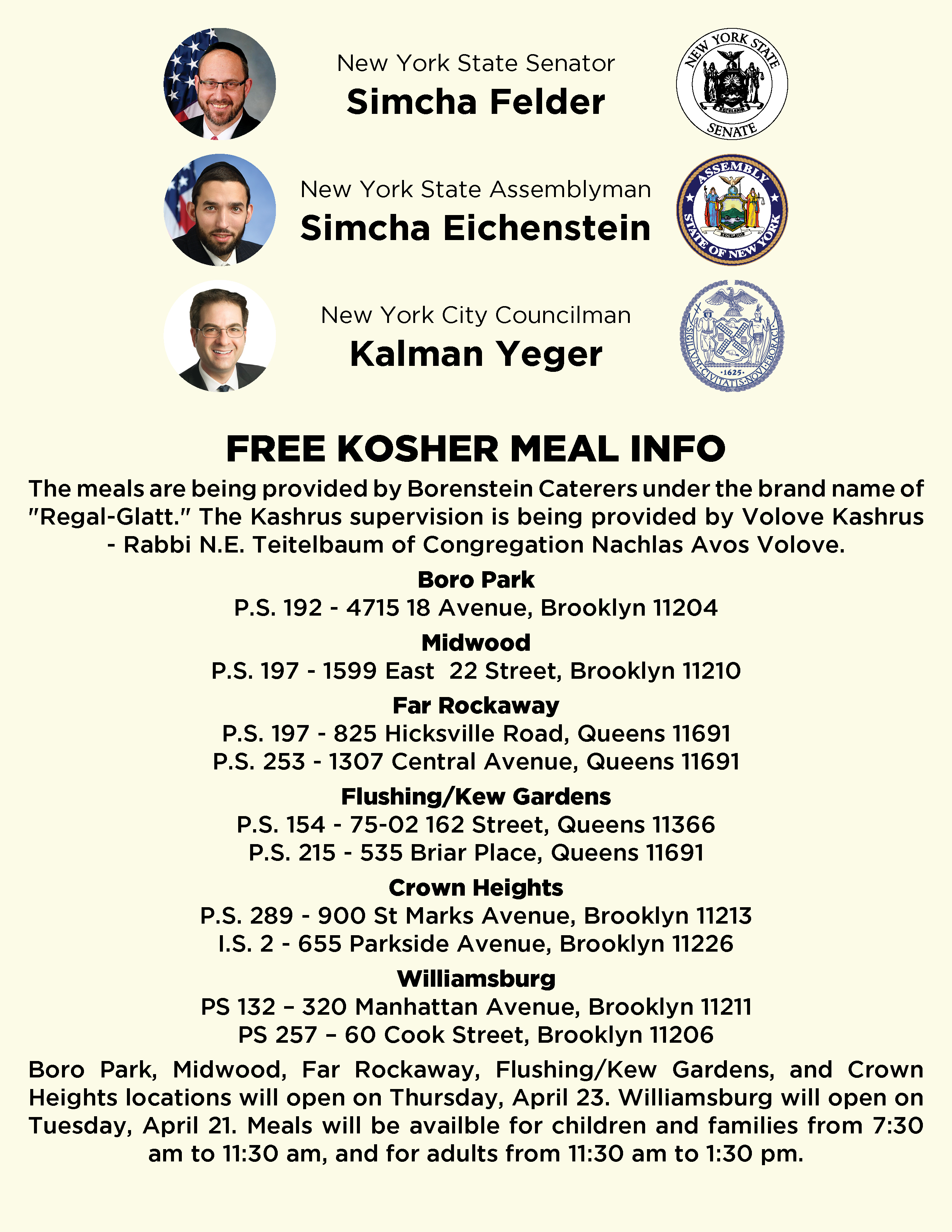 State Senator Simcha Felder, Assemblyman Simcha Eichenstein, and Councilman Kalman Yeger today jointly announced that the NYC Department of Education has agreed to provide Kosher meals for pickup at select public school locations across Brooklyn and Queens.
