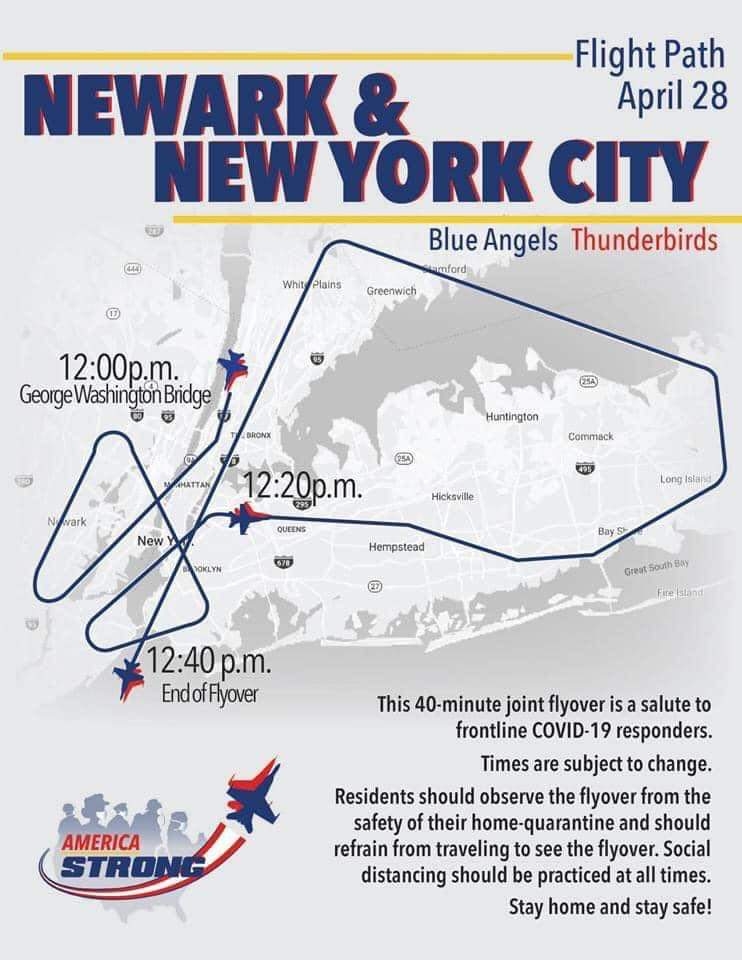 A formation of US Navy Blue Angels and US Air Force Thunderbirds will fly over New York City and Newark, New Jersey beginning at noon Tuesday for about 35 minutes before moving onto Trenton, New Jersey, and Philadelphia, Pennsylvania. These are among the first of multi-city flyovers by the teams to honor essential workers in what the military is calling, “America Strong.”
