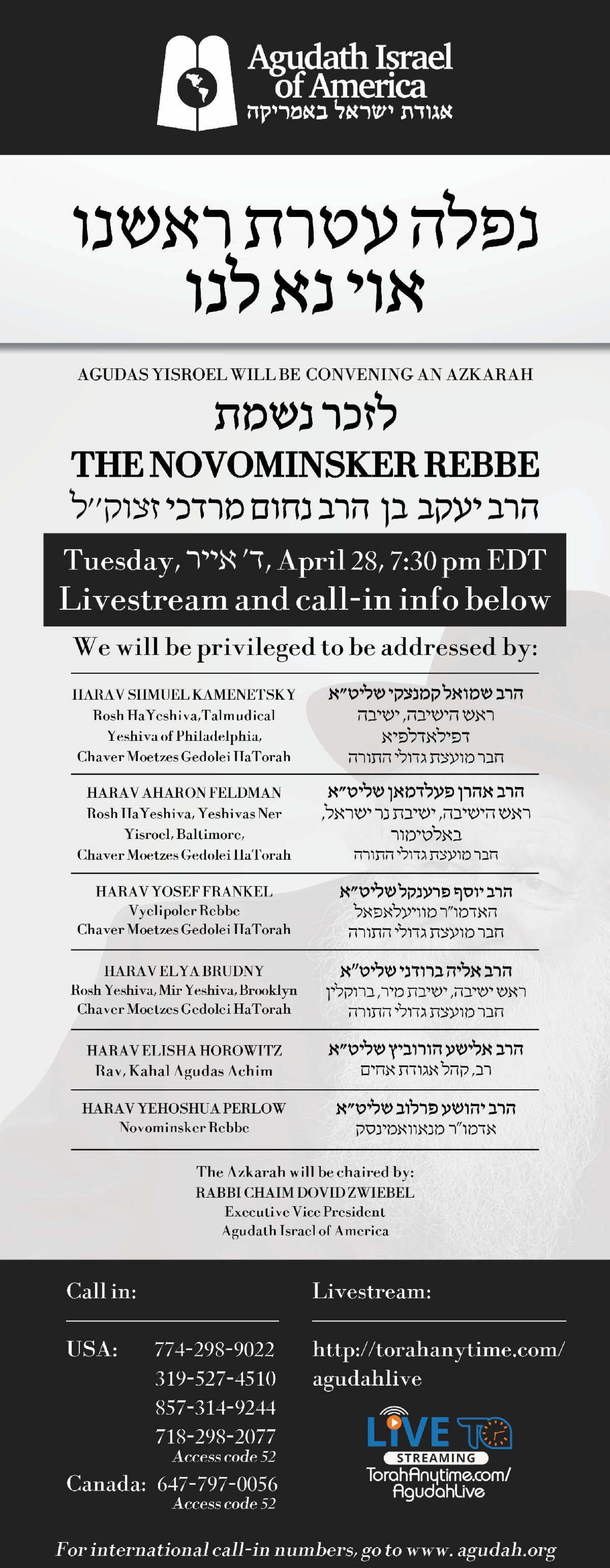 This Tuesday, 4 Iyar, April 28, Agudath Israel of America will be hosting an Azkarah in memory of the Novominsker Rebbe, HaRav Yaakov Perlow Z’’TVKL, Rosh Agudas Yisroel, at 7:30 pm EDT.