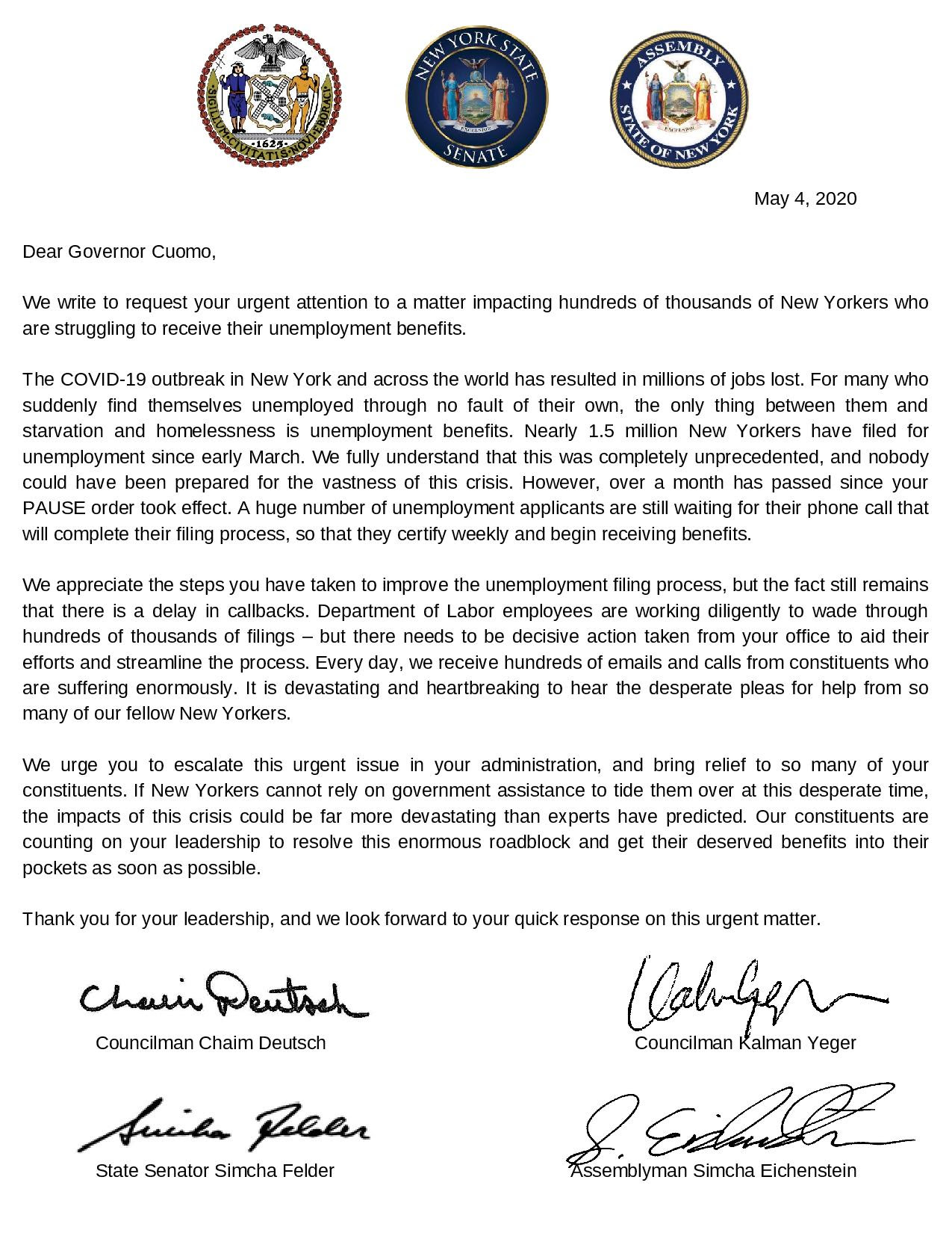 Southern Brooklyn elected officials Councilman Chaim Deutsch, Councilman Kalman Yeger, State Senator Simcha Felder, and Assemblyman Simcha Eichenstein sent a joint letter to Governor Cuomo today, calling for ‘decisive action’ to resolve the backlog in incomplete unemployment filings.