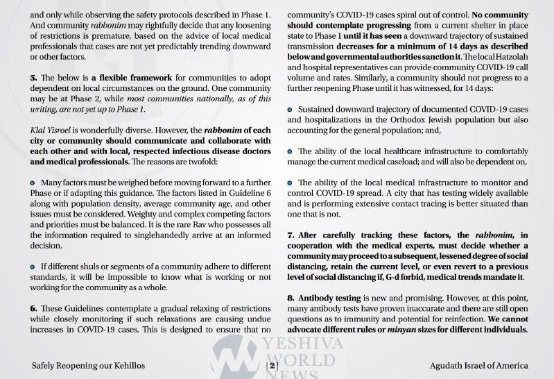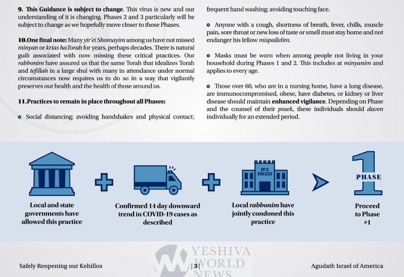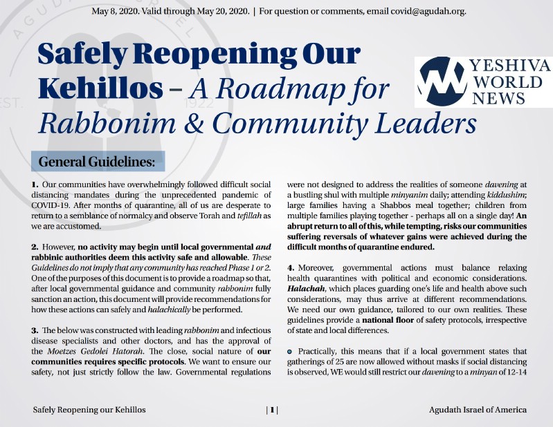 For this reason, at the direction of the Moetzes Gedolei Hatorah, Agudath Israel has worked closely with prominent rabbonim and infectious disease specialists to develop A Roadmap for Rabbonim and Community Leaders to Safely Reopen Our Kehillos.