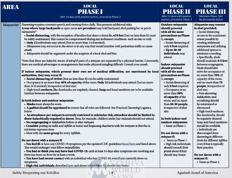 The goal of this comprehensive document is to lay out a plan to return to davening b’tzibbur in a safe and halachicaly sanctioned way. Even if your state – like New York – has not yet eased restrictions, there should be a clear, advance game plan for how to move forward when it does. The Moetzes Gedolei HaTorah-approved guidelines contained in the Roadmap are designed to achieve this purpose.