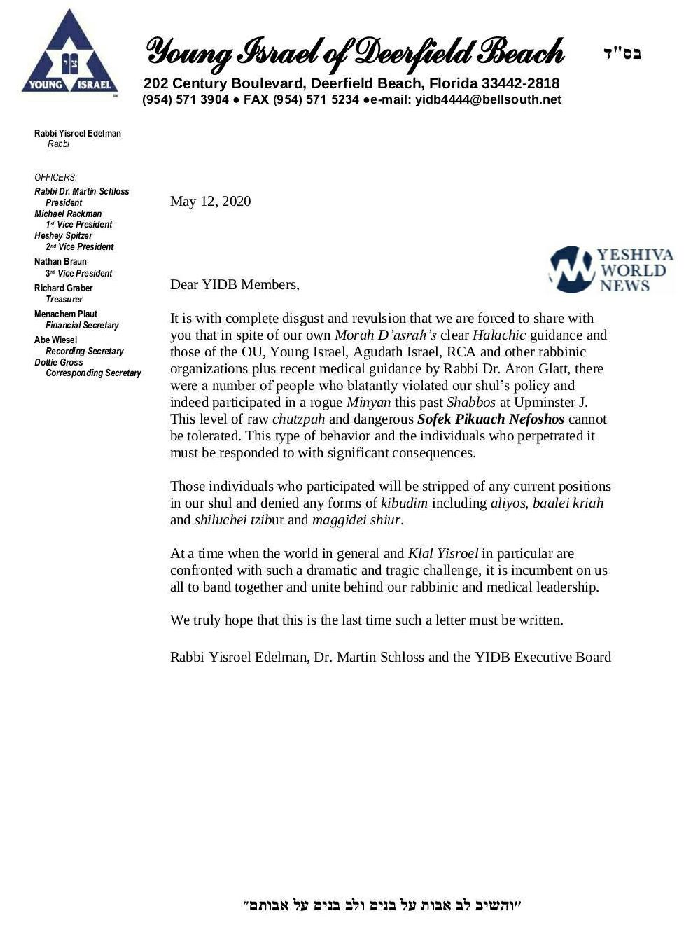 READ THIS LETTER: Florida Shul To Throw Out Members Who Attended “Rogue Minyan”