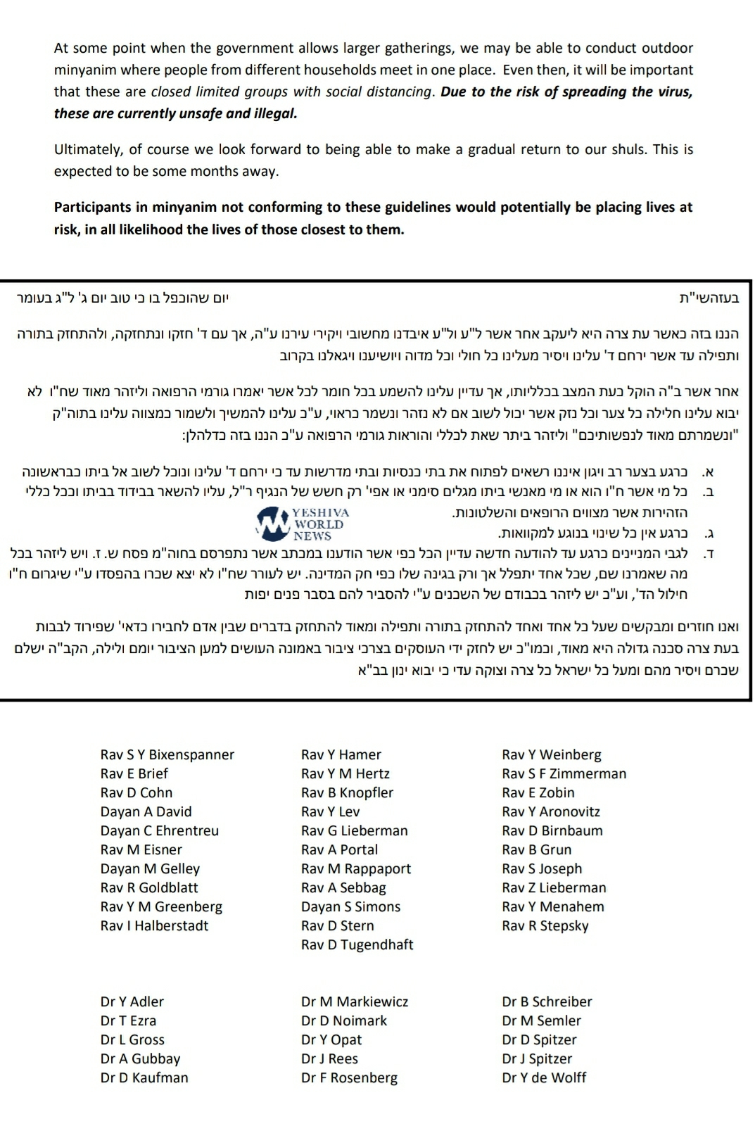 Participants in minyanim not conforming to these guidelines would potentially be placing lives at risk, in all likelihood the lives of those closest to them.