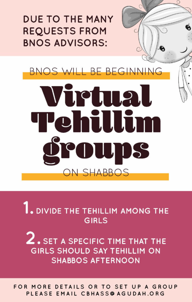 That’s where Bnos Agudath Israel’s newest program comes in. In response to requests from many Bnos advisors, Bnos is launching a brand-new program this Shabbos: Virtual Tehillim Groups.