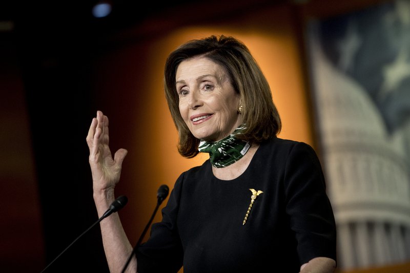 FILE - In this May 14, 2020, file photo House Speaker Nancy Pelosi of Calif., speaks during a news conference on Capitol Hill in Washington. Four of the five members of the Congressional Oversight Commission have been appointed, but Pelosi and Senate Majority Leader Mitch McConnell have not agreed on who should chair the panel. (AP Photo/Andrew Harnik, File)