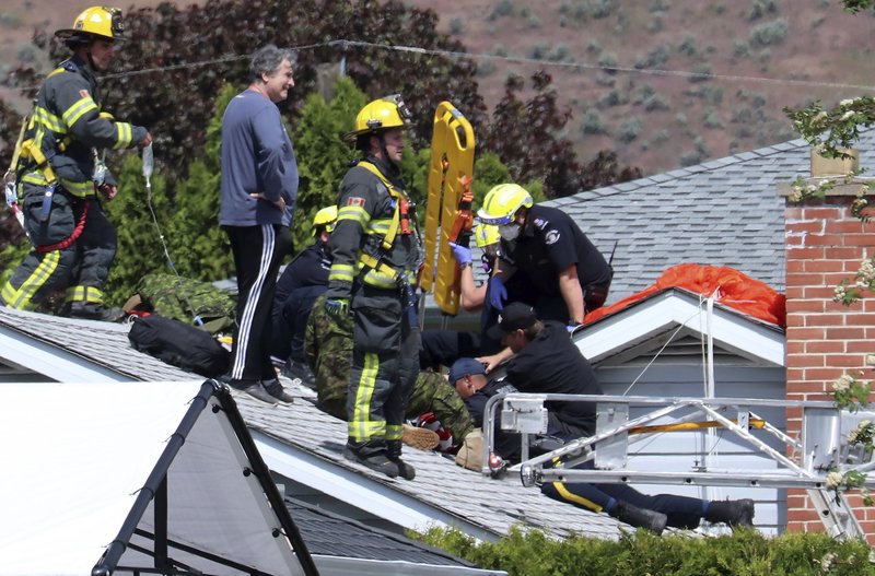 First responders attend to a person on a rooftop at the scene of a crash involving a Canadian Forces Snowbirds airplane in Kamloops, British Columbia, Sunday, May 17, 2020. (Brendan Kergin/Castanet Kamloops/The Canadian Press via AP)