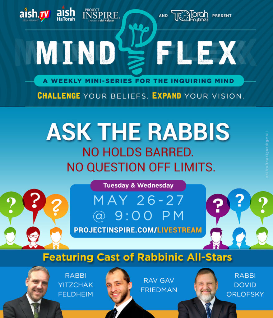 This week’s no holds barred, no questions off limits episodes of Mindflex presented by Project Inspire feature Rabbi Yitzchak Feldheim, Rav Gav Friedman and Rabbi Dovid Orlofsky.