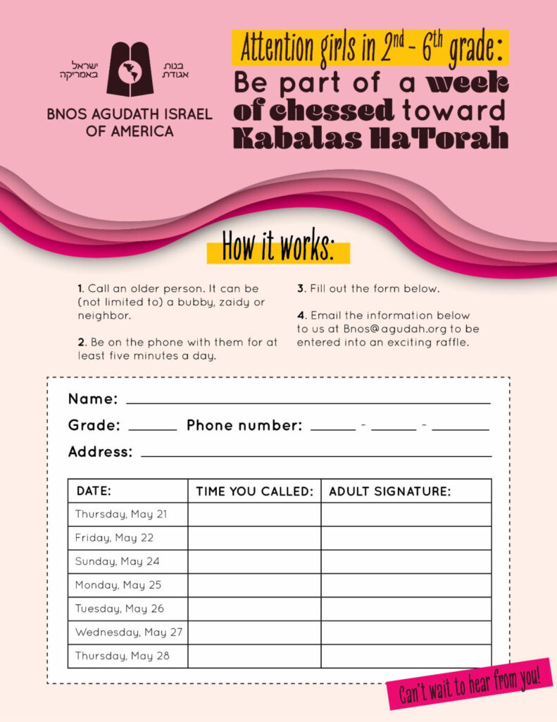 And that’s the motivation behind Bnos Agudath Israel’s newest program: Bnos Chesed Week! Starting this Thursday, May 21, girls in 2nd to 6th grade are invited to cheer up a friend or family member with a daily 5-minute phone call. Girls can log their time on a special form and then email it to Bnos to enter an exciting raffle!