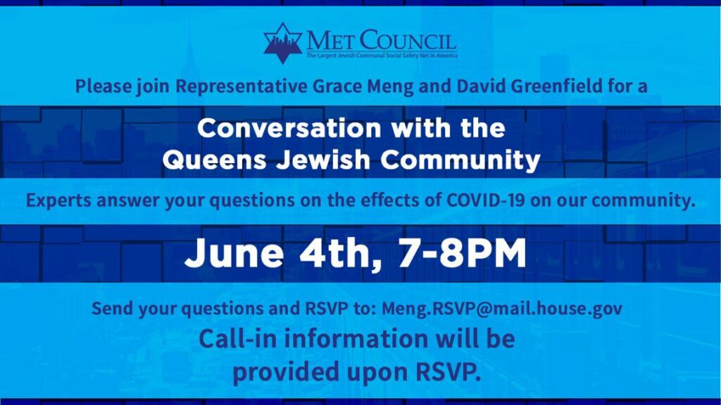As the impact of coronavirus reverberates throughout New York City, Met Council will join Representative Grace Meng for a call-in panel discussion for the Queen’s Jewish community on Thursday, June 4th at 7 pm. Hosted by Met Council CEO David G. Greenfield, the discussion will cover the impacts of COVID-19 and include experts from city, state, and federal agencies.