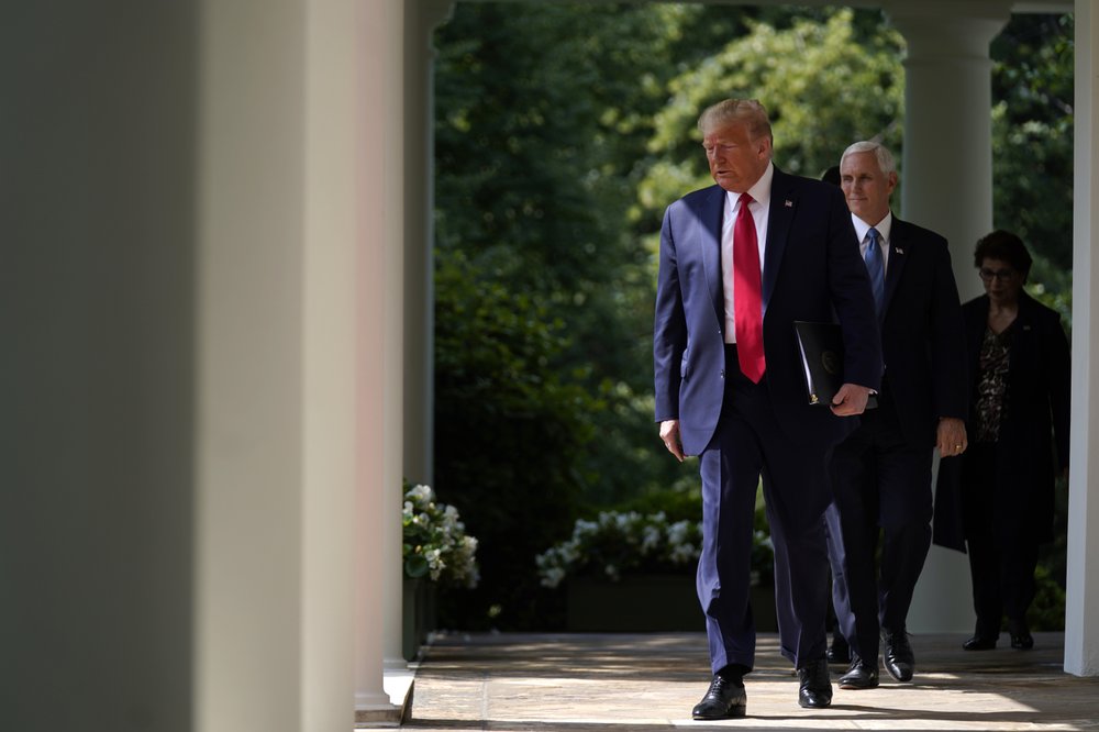 President Donald Trump arrives to speak at a news conference in the Rose Garden of the White House, Friday, June 5, 2020, in Washington. Vice President Mike Pence and Small Business Administration administrator Jovita Carranza are at right. (AP Photo/Evan Vucci)