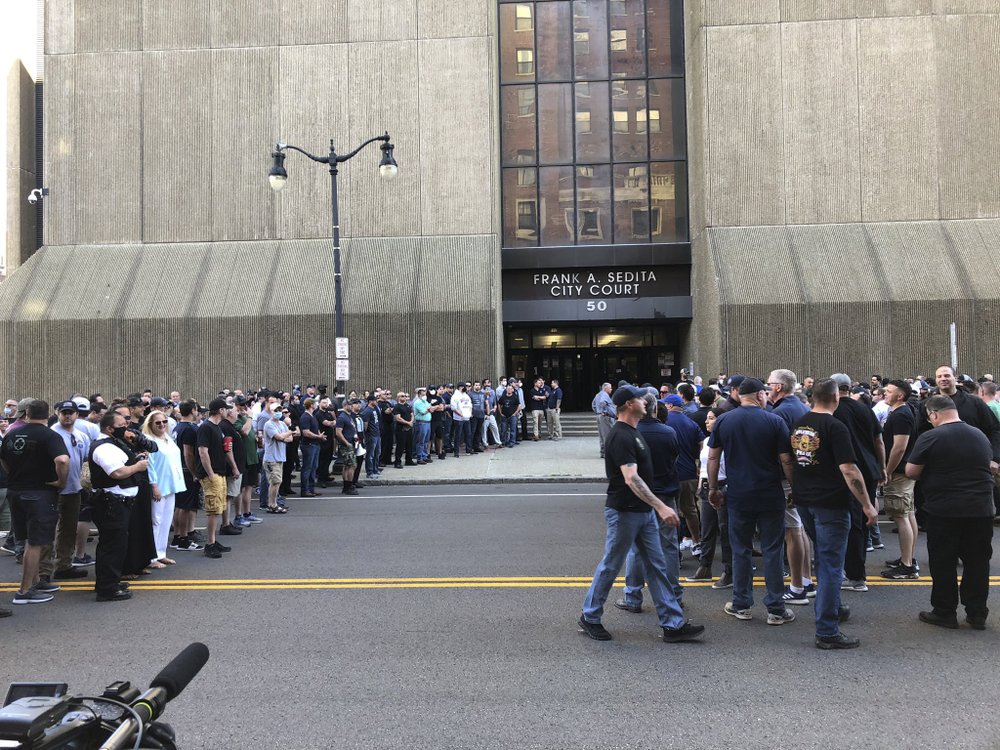 A crowd of off-duty officers, firefighters and others gathered on Saturday outside the courthouse in a show of support for the accused officers and cheered when they were released.
