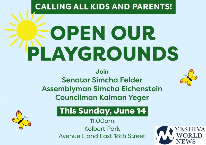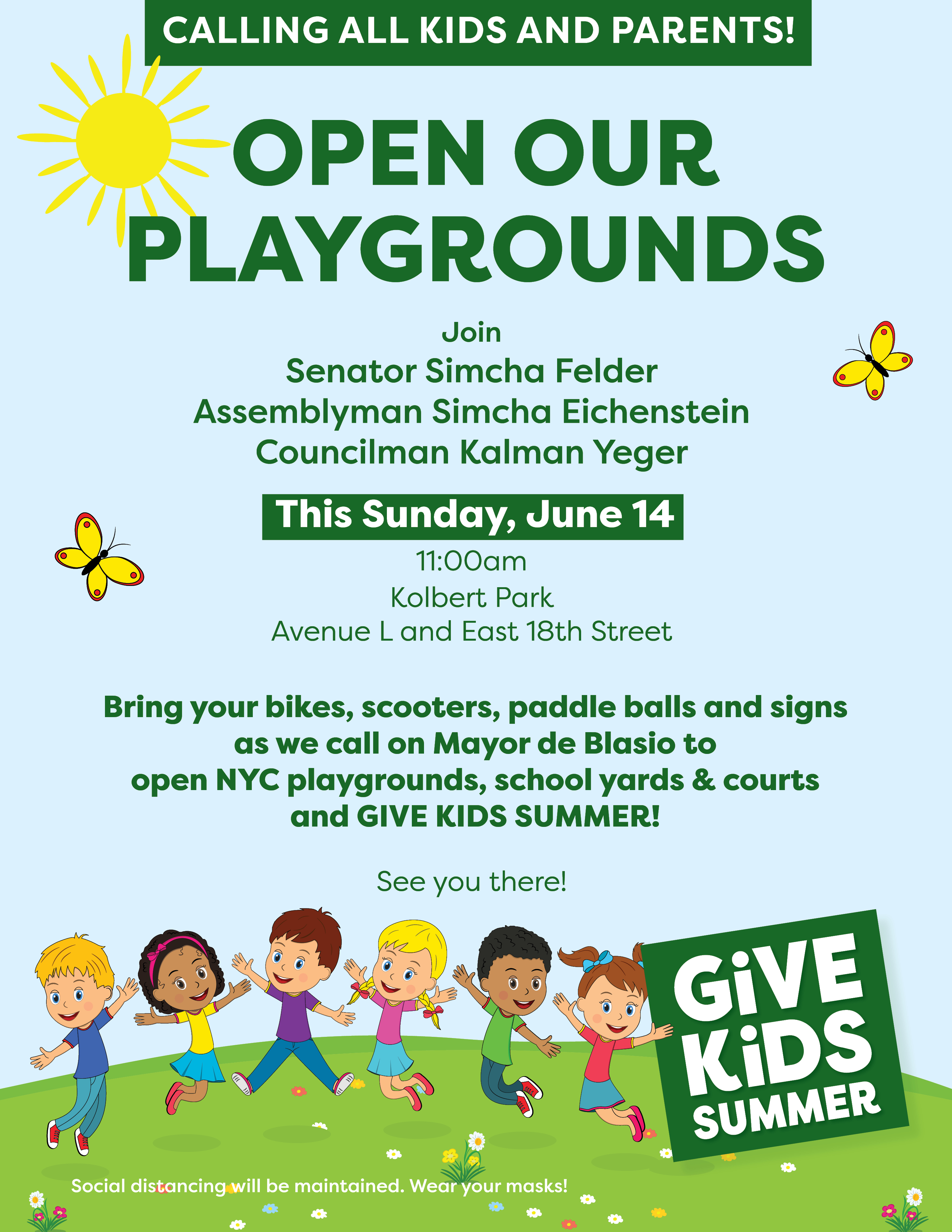 Senator Simcha Felder, Assemblyman Simcha Eichenstein and Councilman Kalman Yeger have been fighting to give NYC kids summer. Families raising children in cramped urban living spaces have responsibly heeded shelter in place orders over four long months. They need relief-NOW! This week Governor Cuomo lifted the order keeping playgrounds closed, but Mayor de Blasio has yet to open them. On Sunday, June 14th they will stand with children and parents to urge Mayor de Blasio to prioritize children and open our playgrounds and schoolyards.