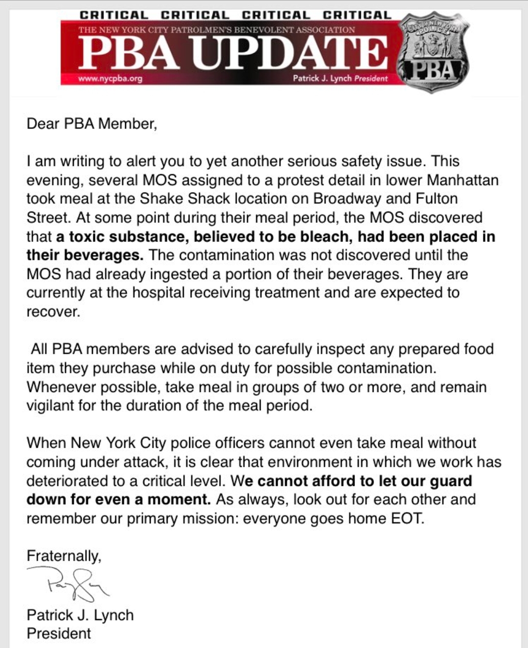 The NYPD PBA sent out the attached statement.