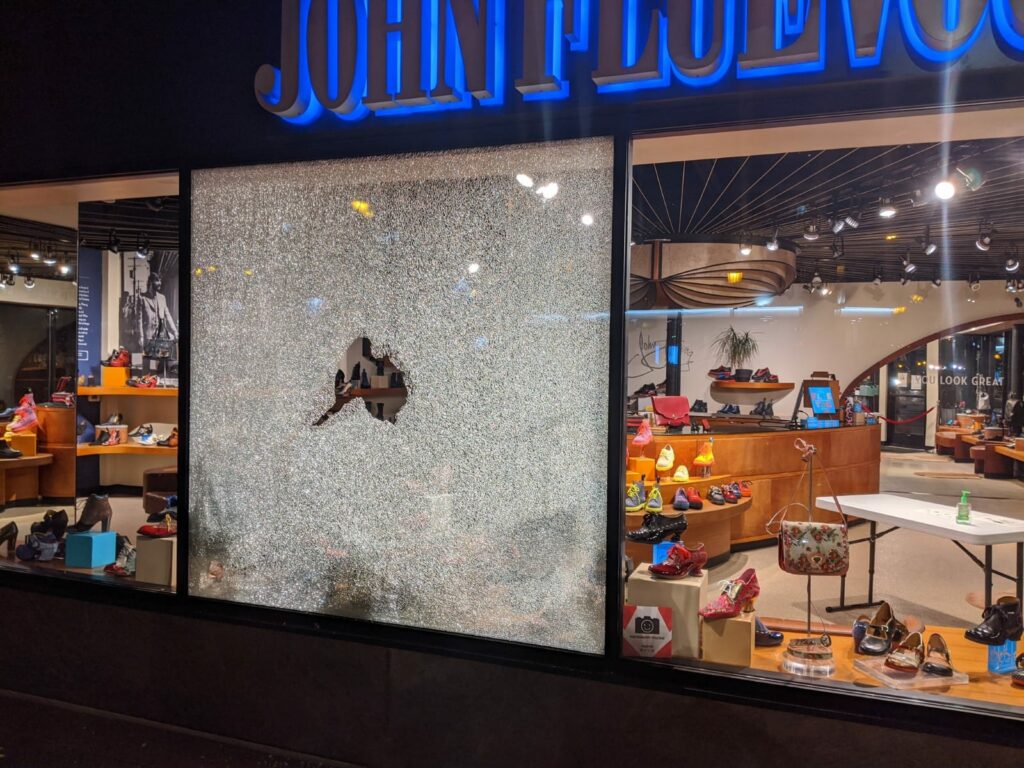 Photographs posted to social media showed windows at the Landmark’s Uptown Theatre and another storefront shot out.