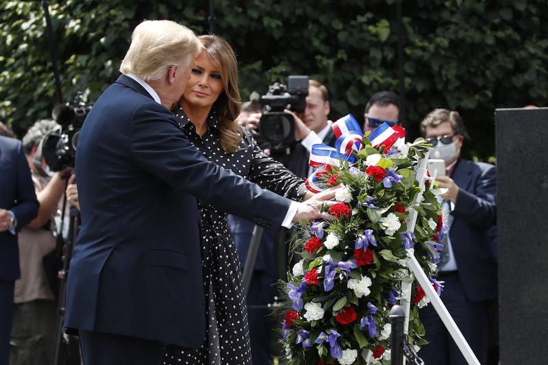 President Donald Trump, accompanied by first lady Melania Trump, places a wreath at the Korean War Veterans Memorial, Thursday, June 25, 2020, in Washington. (AP Photo/Alex Brandon)
