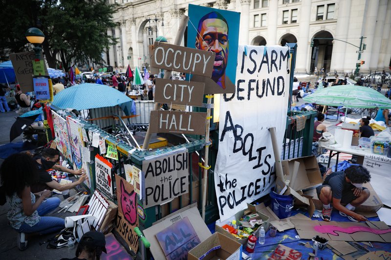 The encampment in City Hall Park in lower Manhattan began forming earlier this week following weeks of street protests sparked by the death of George Floyd and other Black Americans killed by law enforcement. The protesters are part of a national “defund the police” movement seeking more spending on other needs like housing and education.