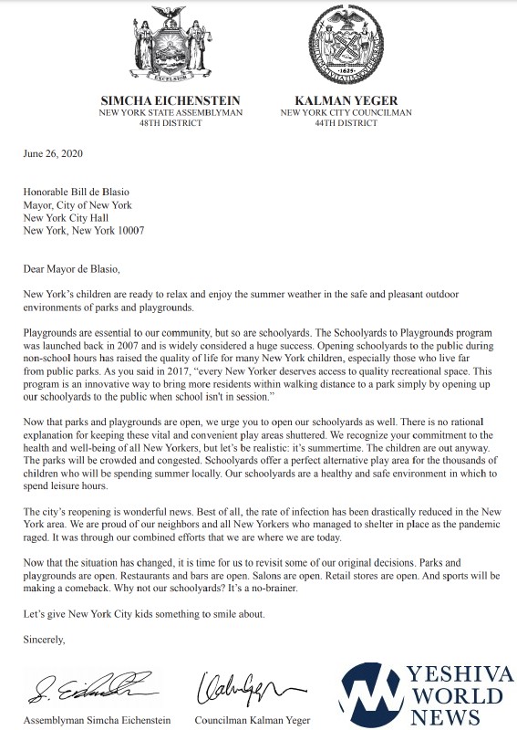 On Friday, June 26th, New York State Assemblyman Simcha Eichenstein and New York City Councilman Kalman Yeger sent a letter to Mayor Bill de Blasio demanding that the city’s public schoolyards be opened so children will have plenty of space to play.