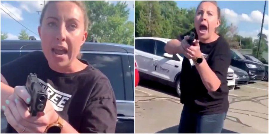 Then, as someone is standing behind the vehicle, Jillian Wuestenberg jumps out and points a handgun in the direction of a person who’s recording. She screams at people to get away from her and her vehicle. A woman shouts, “She’s got a gun on me!” and urges someone in the parking lot to call the police.