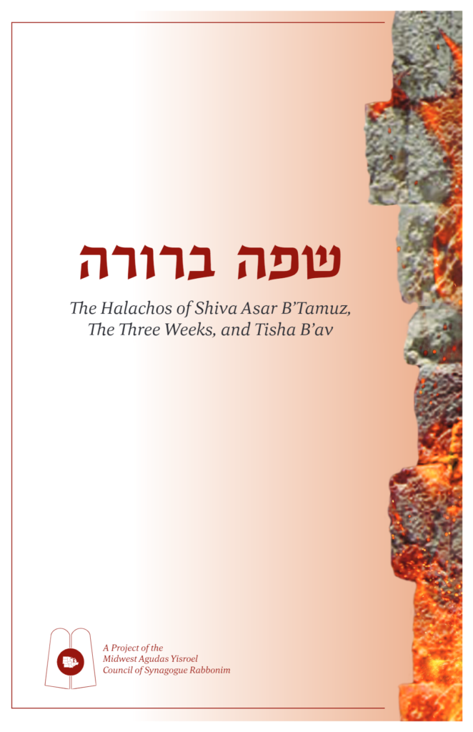 The Midwest Agudas Yisroel Council of Synagogue Rabbonim is pleased to present a sefer on the halachos of Shiva Asar B’Tamuz, the Three Weeks, and Tisha B’Av. The Kuntres covers a wide-range of topics and halachos that occur over this time period.