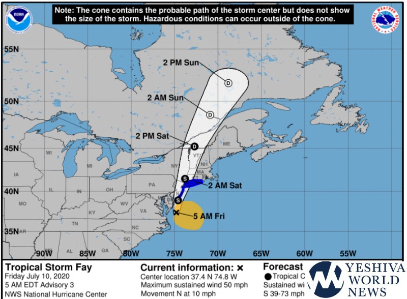 A tropical storm warning was issued for the entire tri-state area ahead of Tropical Storm Fay’s expected landfall on Friday, as the storm churned northward with sustained winds of 50 miles per hour.