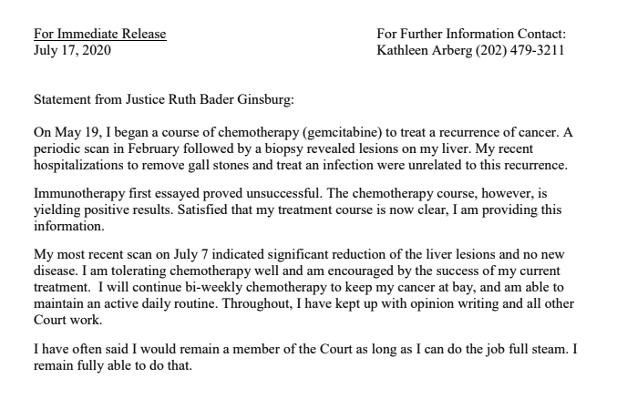 The 87-year-old Ginsburg, who spent time in the hospital this week for a possible infection, said her treatment so far has succeeded in reducing lesions on her liver and that she will continue chemotherapy sessions every two weeks.