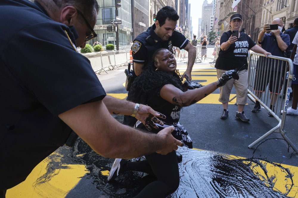 In the latest incident, two women were arrested around 3 p.m. Saturday after police said they poured black paint on the block-long mural outside Trump Tower on Manhattan’s chic Fifth Avenue.