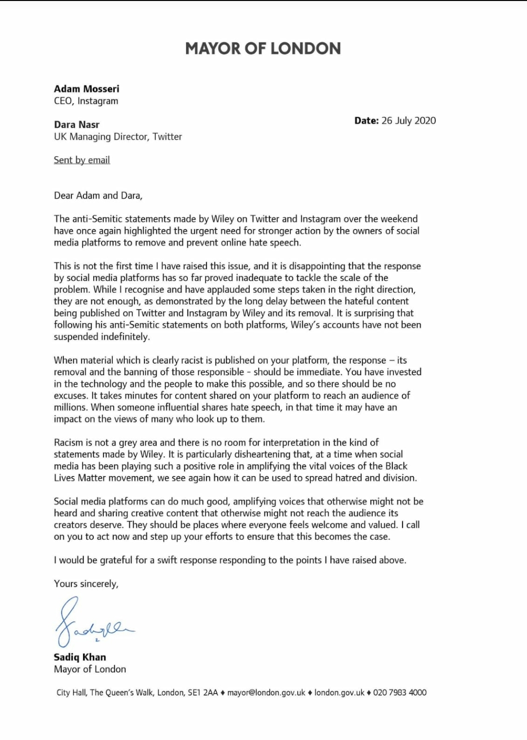 “But at the same time we have set out very clearly that Twitter’s performance has not been good enough in response to the anti-Semitic comments made by Wiley and it needs to do much better,” his spokesman James Slack said.