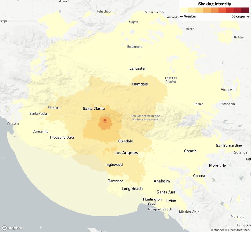 The quake was mostly felt in the Los Angeles metropolitan area, according to the USGS citizen reporting system, but a few reports came from more distant locations.