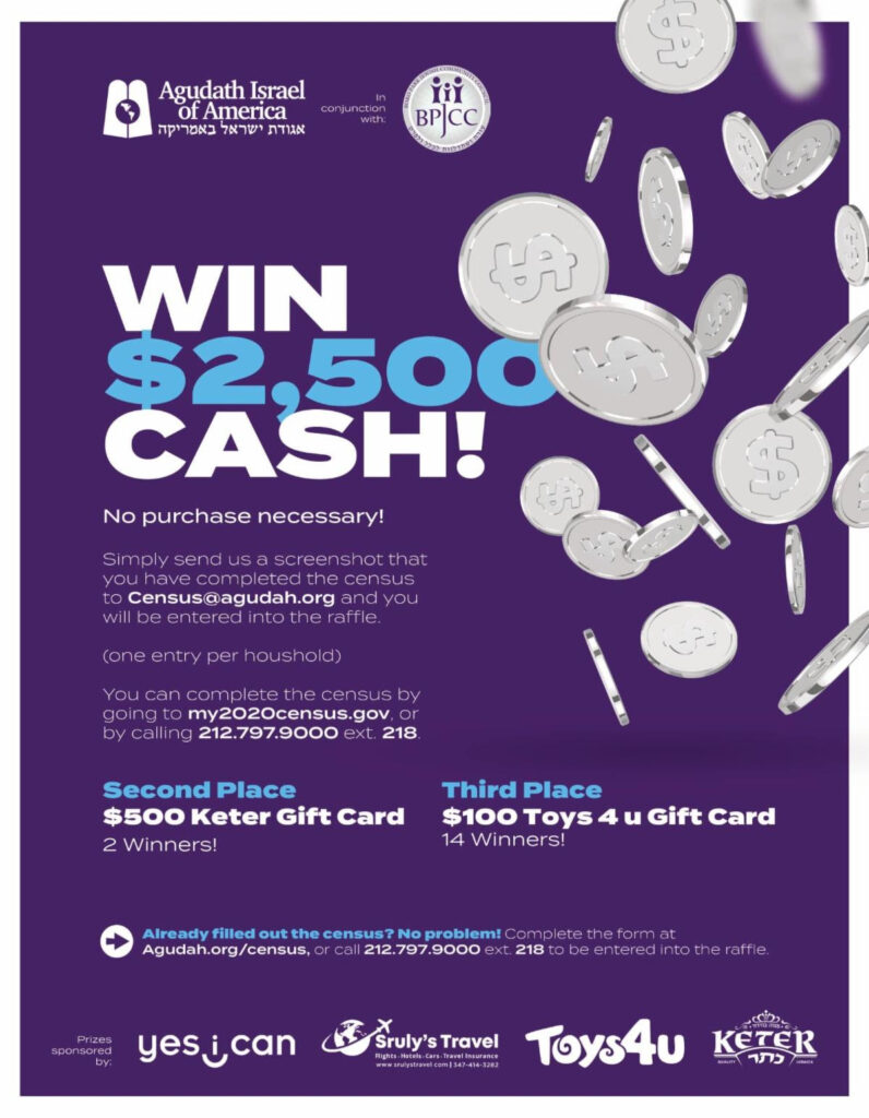 This month, Agudath Israel of America, in conjunction with the Boro Park JCC, is proud to present an additional incentive for census participation. Each household that completes the census will be entered into a raffle to win $2,500. Simply send a screenshot that you completed the census to [email protected] and your family will be included in the pot.