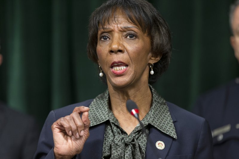 FILE - In this Jan.6, 2020 file photo Los Angeles County District Attorney Jackie Lacey talks during a news conference at the Hall of Justice in Los Angeles. Lacey's husband, David Lacey, on Tuesday, Aug. 4, 2020 was charged in an incident on March 2, 2020, in which he pointed a gun at Black Lives matter protesters outside the Lacey residence, as they demanded a meeting with her at her home the day before a primary election for her seat. (AP Photo/Damian Dovarganes, File)