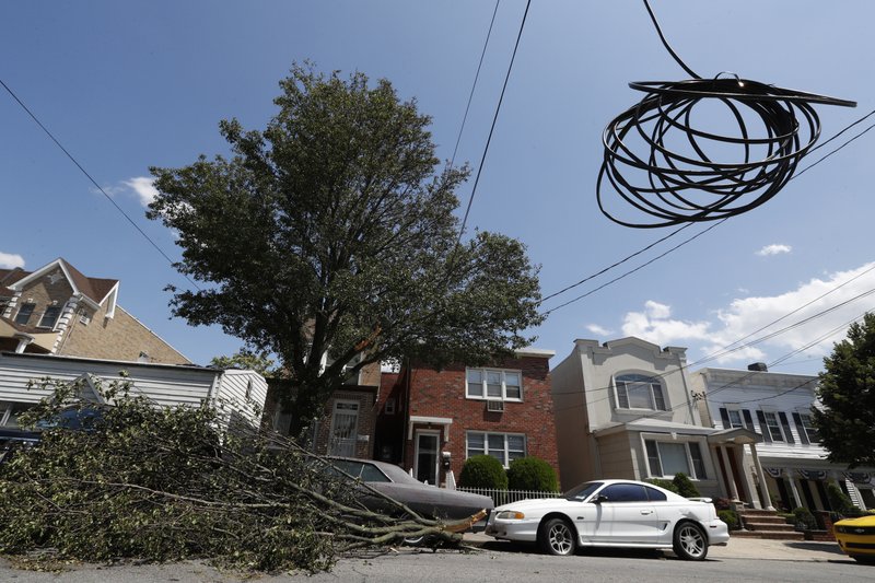 A coiled power line hangs along with electrical wires in a residential neighborhood of Middle Village, Queens, where some homes and businesses lost power in the wake of Tropical Storm Isaias, Wednesday, Aug. 5, 2020, in New York. At the peak of the storm over 130,000 customers had lost power, according the New York Mayor Bill DeBlasio. (AP Photo/Kathy Willens)