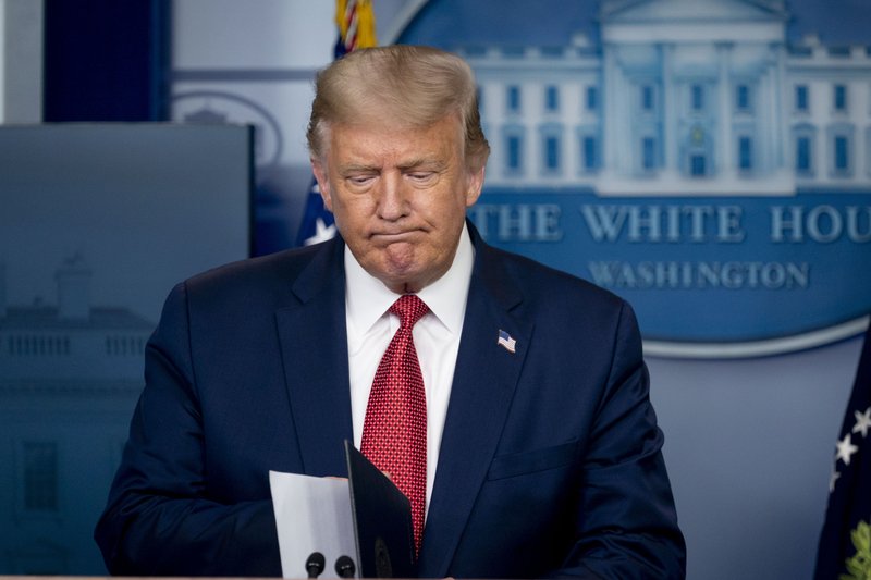 President Donald Trump returns to a news conference in the James Brady Press Briefing Room after he briefly left because of a security incident outside the fence of the White House, Monday, Aug. 10, 2020, in Washington. (AP Photo/Andrew Harnik)