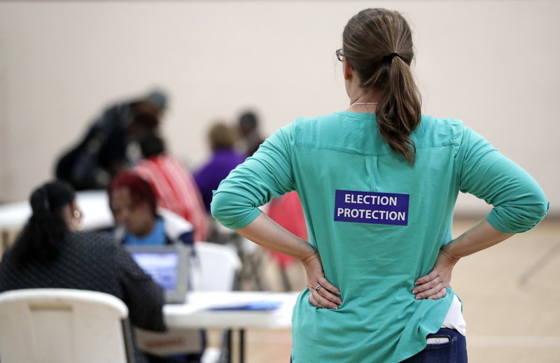 FILE - In this Nov. 8, 2016, file photo, poll watcher Jane Grimes Meneely, right, watches as voters sign in at the Martha O'Bryan Center community building in Nashville, Tenn. (AP Photo/Mark Humphrey, File)