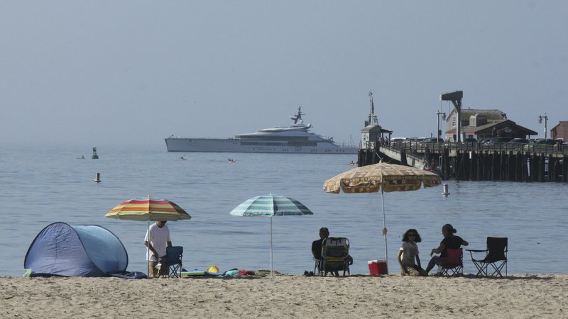 Early beachgoers secure spots on the shore at Santa Barbara, Calif., on Sunday, Aug. 16, 2020, as the superyacht Bravo Eugenia lies offshore. Californians packed beaches, lakes and recreation areas Sunday to seek relief from a record heat wave that strained the electricity grid and threatened to trigger a third round of rolling power outages. The heat wave brought triple-digit temperatures and raised wildfire danger and fears of coronavirus spread — a major concern in a state that has seen more than 621,000 confirmed cases. Public health officers urged people to follow mask and social distancing orders if they head outdoors. (AP Photo/John Antczak)
