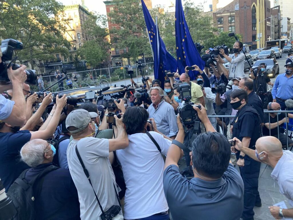 At his hearing, Bannon appeared by video with his hands cuffed in front of him and a white mask covering most of his face. He rocked back and forth on a chair in a holding cell with his lawyers on the telephone. The magistrate judge approved Bannon’s release on $5 million bail, secured by $1.75 million in assets.