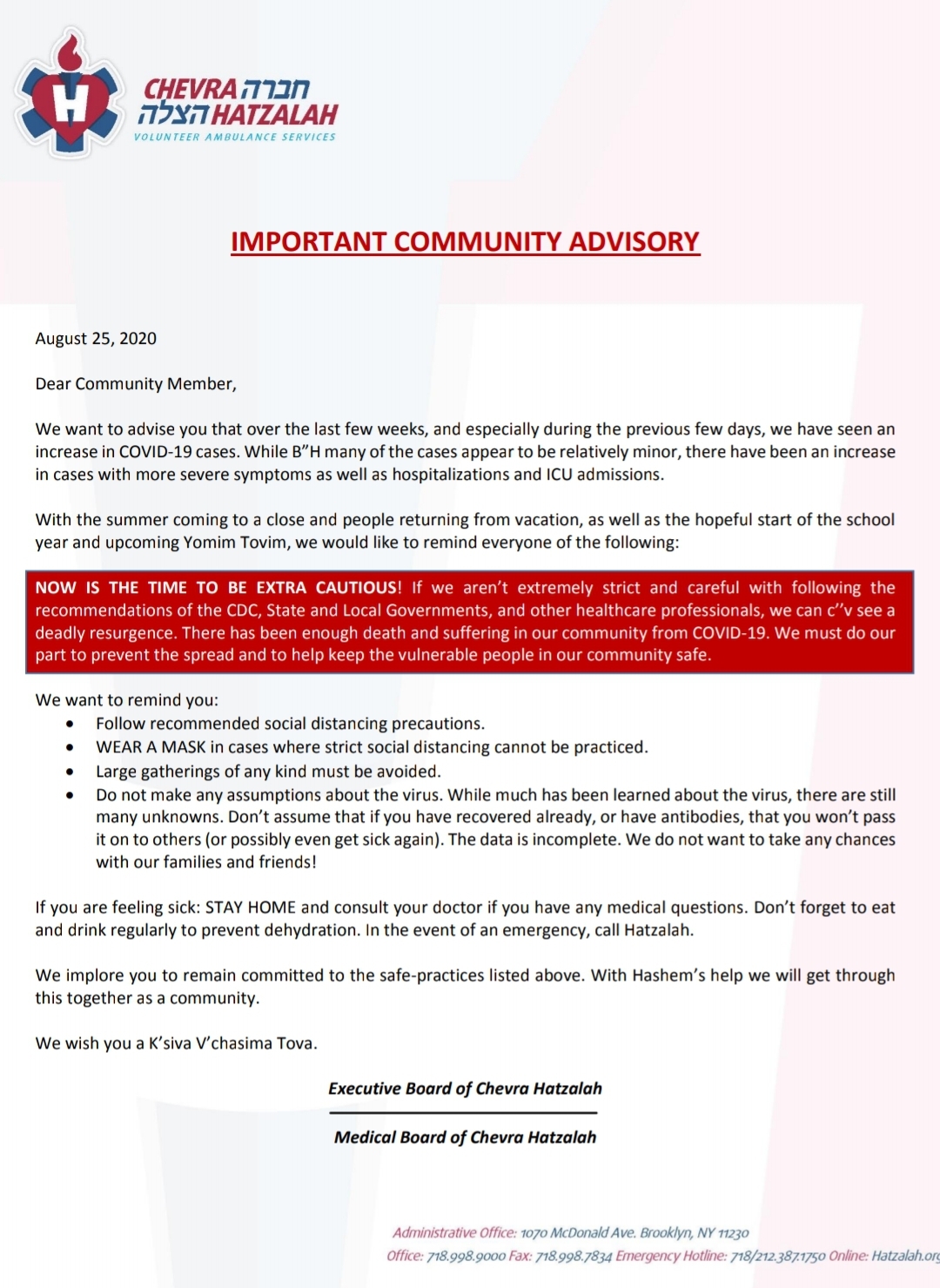 We implore you to remain committed to the safe-practices listed above. With Hashem’s help we will get through