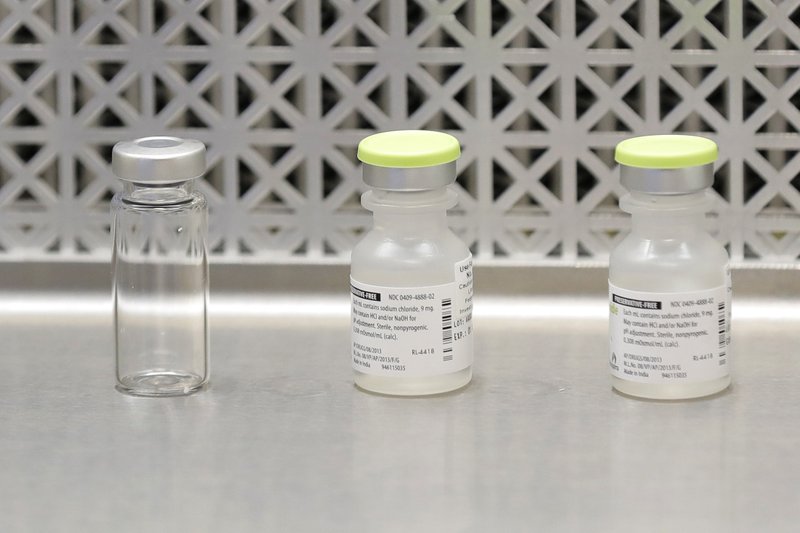 FILE - This March 16, 2020 file photo shows vials used by pharmacists to prepare syringes used on the first day of a first-stage safety study clinical trial of the potential vaccine for COVID-19, the disease caused by the new coronavirus, in Seattle. As the nation awaits a vaccine to end the pandemic, local health departments say they lack the staff, money and tools to distribute, administer and track millions of vaccines, most of which will require two doses. (AP Photo/Ted S. Warren, File)